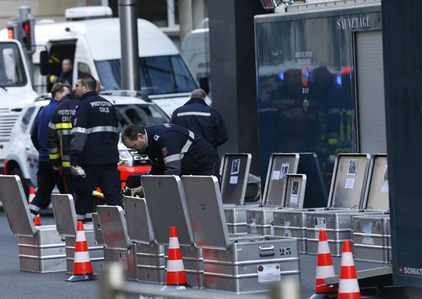 3月22日,在比利時首都布魯塞爾發(fā)生恐怖爆炸事件的馬埃勒貝克地鐵站外,警方調查人員正在取證。新華社記者葉平凡攝