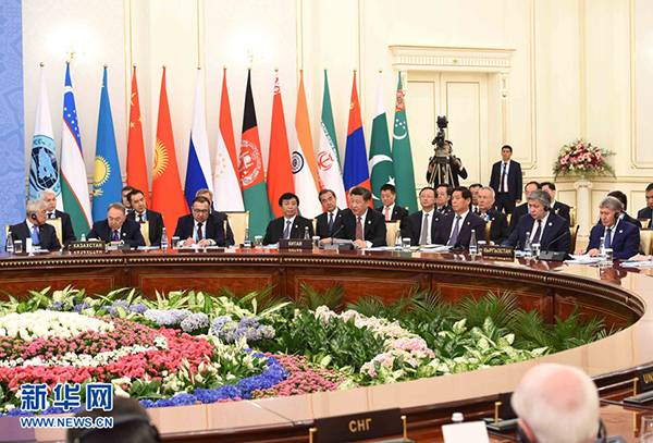 成員國元首先舉行小范圍會談,隨后邀請觀察員國阿富汗總統(tǒng)加尼、白俄羅斯總統(tǒng)盧卡申科、印度總理莫迪、蒙古國總統(tǒng)額勒貝格道爾吉、巴基斯坦總統(tǒng)侯賽因、伊朗外交部長扎里夫,主席國客人土庫曼斯坦總統(tǒng)別爾德穆哈梅多夫以及有關國際和地區(qū)組織代表參加大范圍會談。卡里莫夫主持會議。會議審議了上海合作組織成立15年來的主要成果。與會各方圍繞上海合作組織發(fā)展及當前重大國際和地區(qū)問題交換意見,達成廣泛共識。