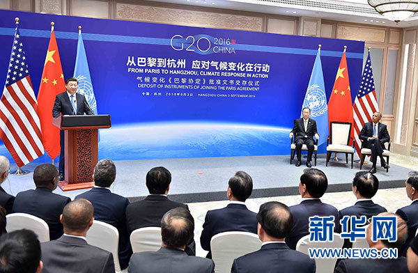 ??? 9月3日,國家主席習(xí)近平同美國總統(tǒng)奧巴馬、聯(lián)合國秘書長潘基文在杭州共同出席氣候變化《巴黎協(xié)定》批準(zhǔn)文書交存儀式。 新華社記者李濤攝