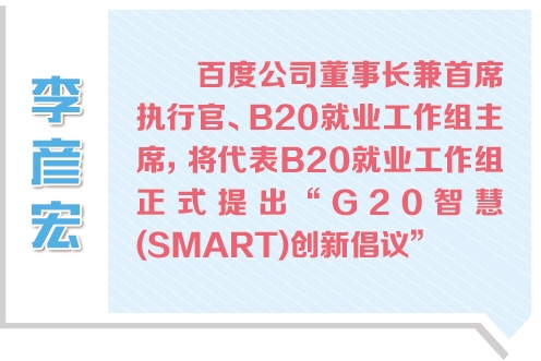 就業(yè)是B20的重點議題之一,也是當今世界面臨的重要問題之一。如何創(chuàng)造更加充分、更高質(zhì)量的就業(yè)機會,推動實現(xiàn)經(jīng)濟的持續(xù)和平衡增長,是各國面臨的重要任務(wù)。根據(jù)G20杭州峰會的“創(chuàng)新增長方式”議題,B20就業(yè)工作組主席、百度公司董事長兼首席執(zhí)行官李彥宏代表B20就業(yè)工作組提出了“G20智慧(SMART)創(chuàng)新倡議”。這一倡議得到了二十國集團工商界、商協(xié)會、國際機構(gòu)和智庫代表的廣泛認可。