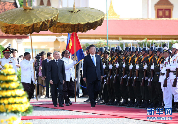 柬埔寨王宮外廣場(chǎng)上,并排矗立著習(xí)近平主席和柬埔寨國(guó)王西哈莫尼的巨幅畫像,畫像下方“中柬友誼萬(wàn)古長(zhǎng)青”的標(biāo)語(yǔ)格外醒目。柬方有關(guān)人士說(shuō),在王宮外廣場(chǎng)一般只擺放柬埔寨國(guó)王的畫像,擺放外國(guó)領(lǐng)導(dǎo)人畫像,歡迎外國(guó)元首來(lái)訪,這在柬埔寨外交史上還是頭一次。