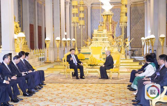 習近平在金邊會見柬埔寨國王西哈莫尼。(新華社記者謝環(huán)馳攝)