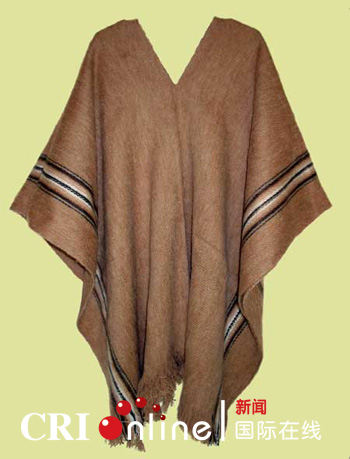 ????彭丘是用羊駝毛織成的披風(fēng),面料質(zhì)地十分細(xì)膩,胸口開V字領(lǐng),形狀像長方形的毛毯,兩側(cè)的擺有黑白相間的傳統(tǒng)花邊。顏色采取深棕色,披在身上呈寬松的倒三角廓形,傳統(tǒng)花邊的點(diǎn)綴極具地域特色。
