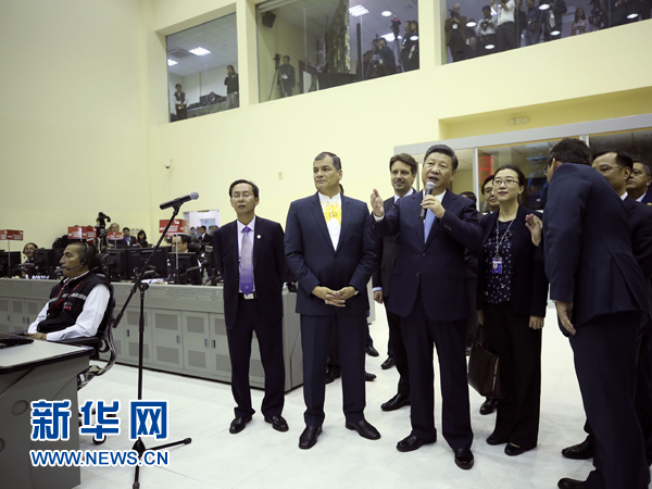 習(xí)近平抵達公共安全應(yīng)急指揮中心時,科雷亞在門口迎接。兩國元首共同參觀中方支援厄瓜多爾抗震救災(zāi)圖片展,并為厄瓜多爾公共安全應(yīng)急指揮中心聯(lián)合實驗室揭牌。兩國元首觀看介紹喬內(nèi)醫(yī)院和辛克雷水電站的視頻,并同項目現(xiàn)場人員連線互動。喬內(nèi)醫(yī)院現(xiàn)場中方負責(zé)人向兩國元首報告醫(yī)院工程正式開工。在辛克雷水電站,專程前往現(xiàn)場的厄瓜多爾副總統(tǒng)格拉斯介紹項目完成情況。兩國元首共同按動按鈕,辛克雷水電站正式竣工發(fā)電。