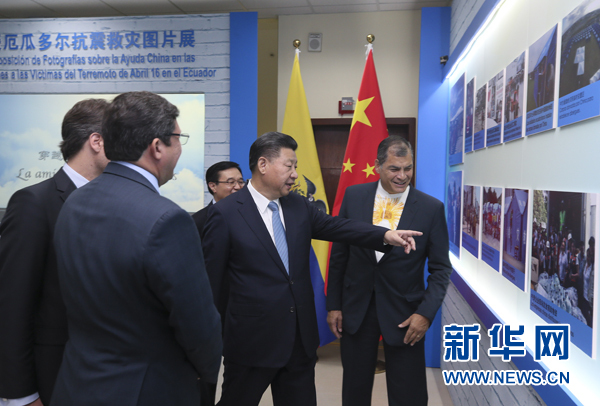 當?shù)貢r間11月18日,國家主席習(xí)近平在基多同厄瓜多爾總統(tǒng)科雷亞共同出席中方援建的厄瓜多爾公共安全應(yīng)急指揮中心聯(lián)合實驗室揭牌儀式,喬內(nèi)醫(yī)院奠基、科卡科多-辛克雷水電站竣工發(fā)電視頻連線活動。這是兩國元首共同參觀中方支援厄瓜多爾抗震救災(zāi)圖片展。新華社記者 蘭紅光 攝
