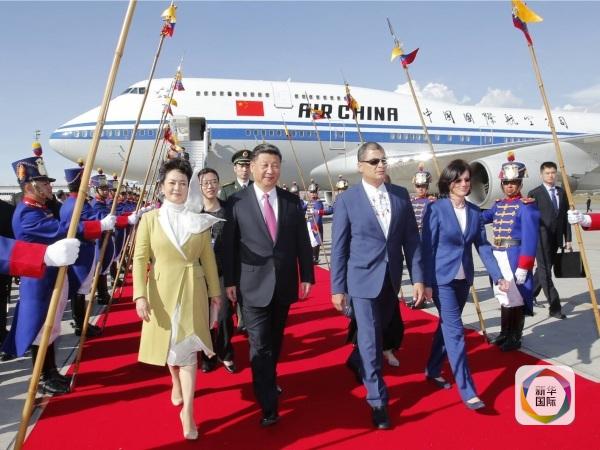 為了迎接習主席夫婦,科雷亞總統(tǒng)打破厄國內(nèi)《公共典禮條例》和總統(tǒng)不赴機場迎送外國元首的慣例,親赴機場主持隆重的歡迎儀式;兩名身著民族服裝的當?shù)貎和蛄曋飨驄D獻上鮮花;兩國元首登上檢閱臺,軍樂隊奏響中厄兩國國歌。習主席和科雷亞總統(tǒng)分別發(fā)表了熱情洋溢的致辭。