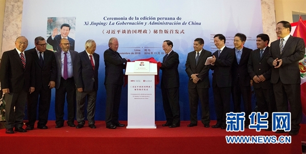11月19日,在秘魯首都利馬,中宣部常務(wù)副部長、中央文明辦主任黃坤明(右六)與秘魯駐歐盟大使、前外交部長貢薩洛·古鐵雷斯(左五)共同為《習(xí)近平談治國理政》秘魯版首發(fā)揭幕。當(dāng)日,《習(xí)近平談治國理政》秘魯版首發(fā)式在秘魯國家圖書館舉行。 新華社記者李明攝