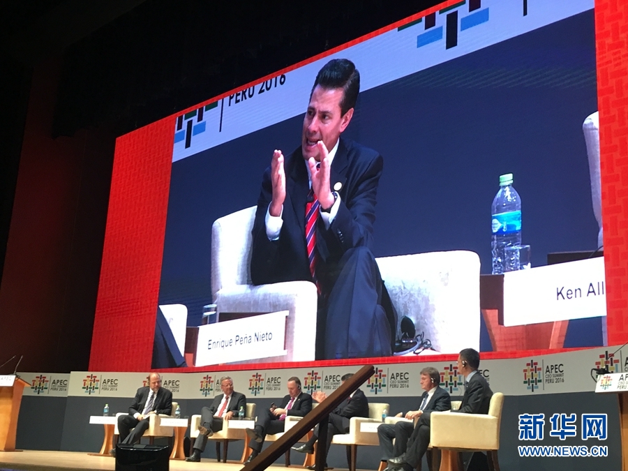 ????新華網(wǎng)北京11月22日電 當(dāng)?shù)貢r間11月19日,APEC工商領(lǐng)導(dǎo)人峰會舉行主題為“重新設(shè)計(jì)貿(mào)易”的現(xiàn)場討論會。圖為墨西哥總統(tǒng)涅托在討論會上發(fā)言。
