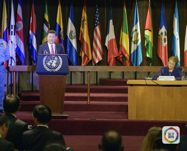 國(guó)家主席習(xí)近平在圣地亞哥聯(lián)合國(guó)拉丁美洲和加勒比經(jīng)濟(jì)委員會(huì)總部出席中拉媒體領(lǐng)袖峰會(huì)開幕式。智利總統(tǒng)巴切萊特陪同出席。在熱烈的掌聲中,習(xí)近平發(fā)表題為《開創(chuàng)中拉媒體合作新局面》的致辭。(新華社記者王曄攝)