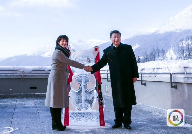 1月17日,國(guó)家主席習(xí)近平同瑞士聯(lián)邦主席洛伊特哈德在達(dá)沃斯共同啟動(dòng)中瑞旅游年。兩國(guó)元首在熊貓冰雕像和印有中瑞兩國(guó)國(guó)旗及“中瑞旅游年”字樣的滑雪板旁合影留念。(新華社記者 丁林 攝)