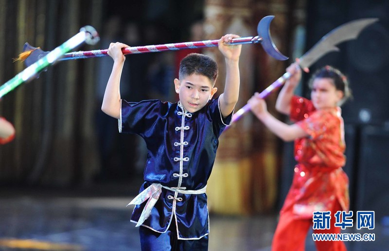 1月18日晚,烏茲別克斯坦首都塔什干人民友誼宮,烏茲別克斯坦中華民族文化中心武術(shù)隊(duì)隊(duì)員在表演武術(shù)。