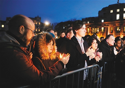 3月23日,在英國倫敦特拉法加廣場,人們參加燭光守夜悼念活動。新華社記者 韓 巖攝