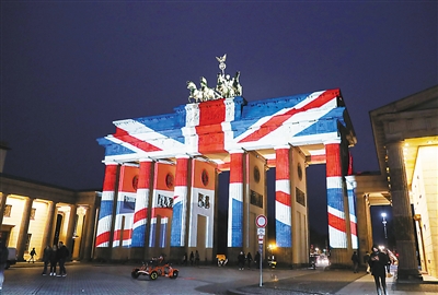 3月23日,在德國首都柏林,英國國旗樣式的彩燈點亮勃蘭登堡門,悼念英國倫敦恐怖襲擊事件中的遇難者。 新華社記者 單宇琦攝