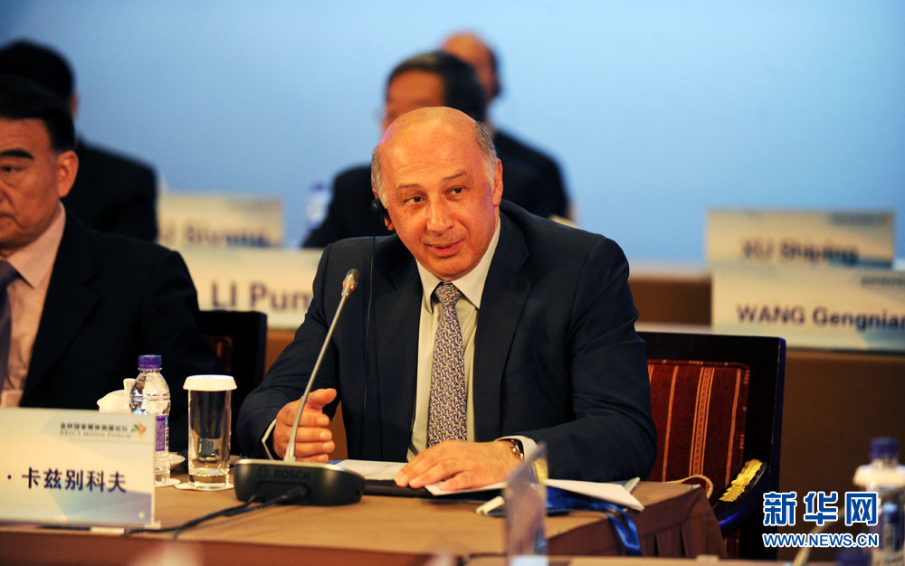 金磚國(guó)家媒體高端論壇開(kāi)幕式6月8日在北京舉行。圖為金磚國(guó)家新開(kāi)發(fā)銀行副行長(zhǎng)卡茲別科夫致辭。 新華網(wǎng) 孫韜 攝