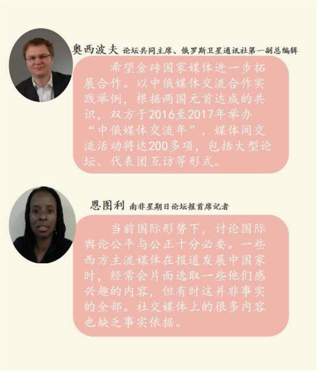與會(huì)代表對(duì)提升金磚國(guó)家話語(yǔ)權(quán)有哪些構(gòu)想?未來將如何開展合作?將如何順應(yīng)信息傳播新形勢(shì)?一起聽聽他們?cè)趺凑f!