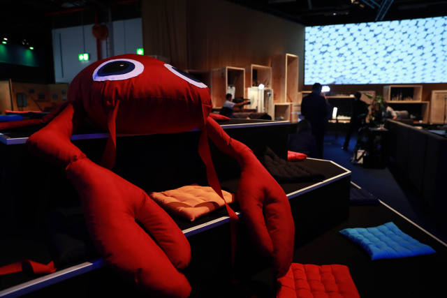↑這是7月6日在德國(guó)漢堡拍攝的G20領(lǐng)導(dǎo)人峰會(huì)國(guó)際新聞中心餐飲區(qū)擺放的螃蟹造型玩偶。新華社記者羅歡歡攝