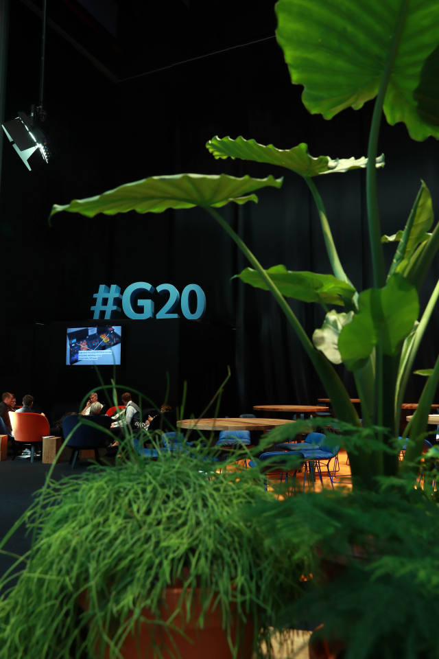 ↑這是7月6日在德國(guó)漢堡拍攝的G20領(lǐng)導(dǎo)人峰會(huì)國(guó)際新聞中心內(nèi)擺放的植物。新華社記者羅歡歡攝