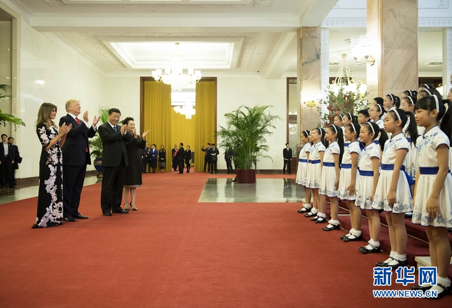 11月9日,國家主席習(xí)近平在北京人民大會(huì)堂東門外廣場舉行歡迎儀式,歡迎美利堅(jiān)合眾國總統(tǒng)唐納德·特朗普對中國進(jìn)行國事訪問。這是習(xí)近平和夫人彭麗媛同特朗普夫婦在人民大會(huì)堂欣賞文藝表演。新華社記者 李學(xué)仁 攝