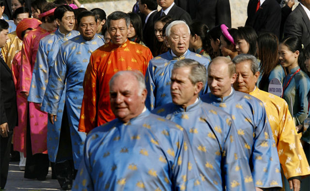 2006年,APEC領(lǐng)導人非正式會議在越南舉辦。當年,各經(jīng)濟體領(lǐng)導人穿的是越南傳統(tǒng)服裝——奧黛。
