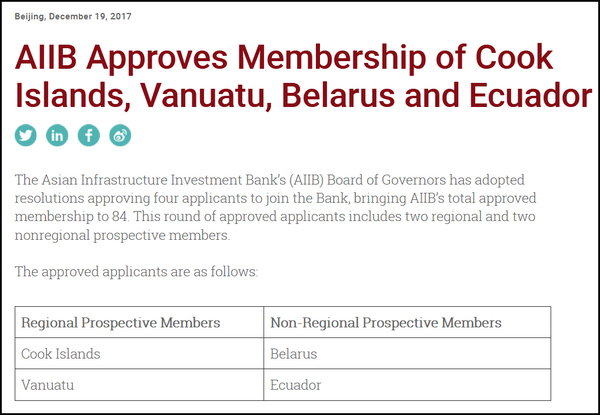 【第四次“擴容”】2017年12月19日,亞投行宣布批準庫克群島、瓦努阿圖、白俄羅斯和厄瓜多爾四個成員的加入申請,成員增至84個,這是亞投行自開業(yè)以來的第四次“擴容”。圖為亞投行官網截圖。(新華網國際頻道 徐海知)