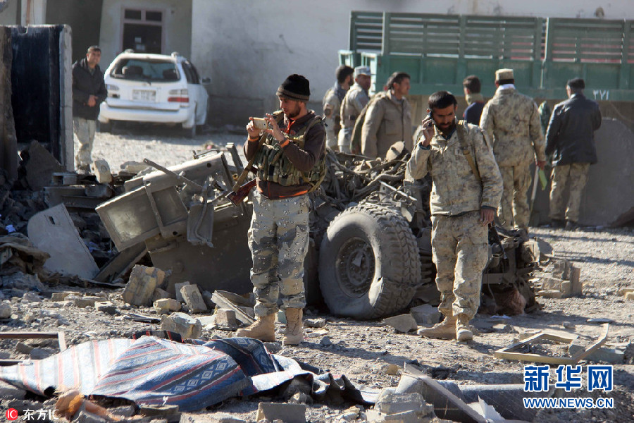 當(dāng)?shù)貢r(shí)間22日,阿富汗坎大哈,當(dāng)?shù)匾惶幘炜偛吭庥鲎詺⑹狡囌◤椧u擊,造成至少6名警察死亡,4人受傷。圖為阿富汗安全官員檢查現(xiàn)場(chǎng)。(圖片來源:東方IC)