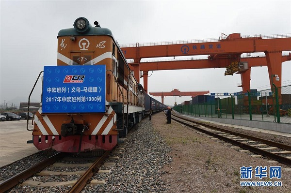5月13日,2017年第1000列中歐班列從義烏西站駛出。當(dāng)日,X8024次中歐班列(義烏-馬德里)從浙江義烏鐵路西站鳴笛駛出。這列滿載小商品、服裝等貨物的列車是2017年開行的第1000列中歐班列。中國鐵路總公司統(tǒng)計顯示,2017年中歐班列開行數(shù)量較去年同期增加612列,增長158%。新華社發(fā)(龔獻(xiàn)明 攝)