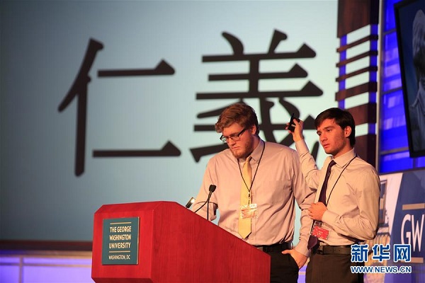11月18日,在美國首都華盛頓的喬治·華盛頓大學(xué),參賽選手進(jìn)行中文演講。美國喬治·華盛頓大學(xué)中國學(xué)生學(xué)者聯(lián)合會和喬治·華盛頓大學(xué)孔子學(xué)院聯(lián)合主辦的第一屆“華語擂臺”漢語辯論賽18日落下帷幕。來自賓夕法尼亞州、猶他州、佛羅里達(dá)州等美國多地的10名參賽者兩兩組隊(duì),通過成語挑戰(zhàn)、現(xiàn)場問答和團(tuán)隊(duì)辯論三種形式,展示了各自的漢語知識、語言和思辨能力及個人風(fēng)采。新華社記者 楊承霖 攝