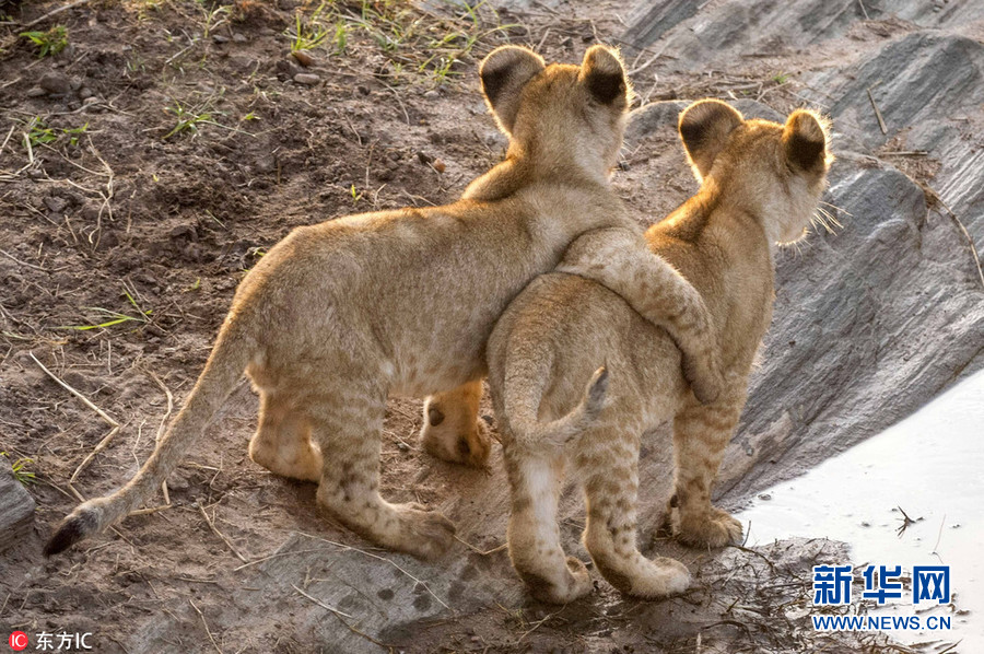 1月2日?qǐng)?bào)道(具體拍攝時(shí)間不詳),肯尼亞馬賽馬拉國(guó)家保護(hù)區(qū),64歲的攝影師Ingo Gelach在當(dāng)?shù)嘏臄z到一組有趣又暖心的照片。畫面中,兩頭小獅子站在水邊,似乎正考慮跨越面前的水域。其中一頭獅子用前腳搭在同伴的肩膀上,似乎在表達(dá)友好,又似是在鼓勵(lì)同伴不要害怕,勇敢地跨過去。(圖片來(lái)源:東方IC)