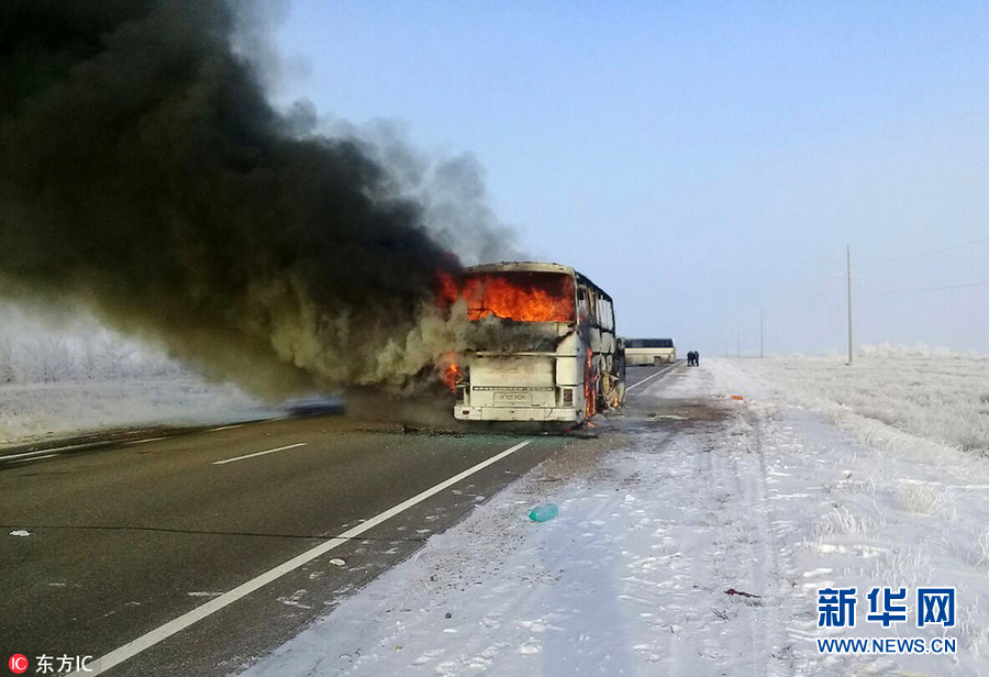 1月18日,哈薩克斯坦阿克托別市(Aktobe),一輛巴士在行駛途中著火,造成至少52人喪生。報(bào)道稱(chēng)只有5名人從著火的車(chē)中逃生,遇難者均為烏茲別克斯坦公民。(圖片來(lái)源:東方IC)