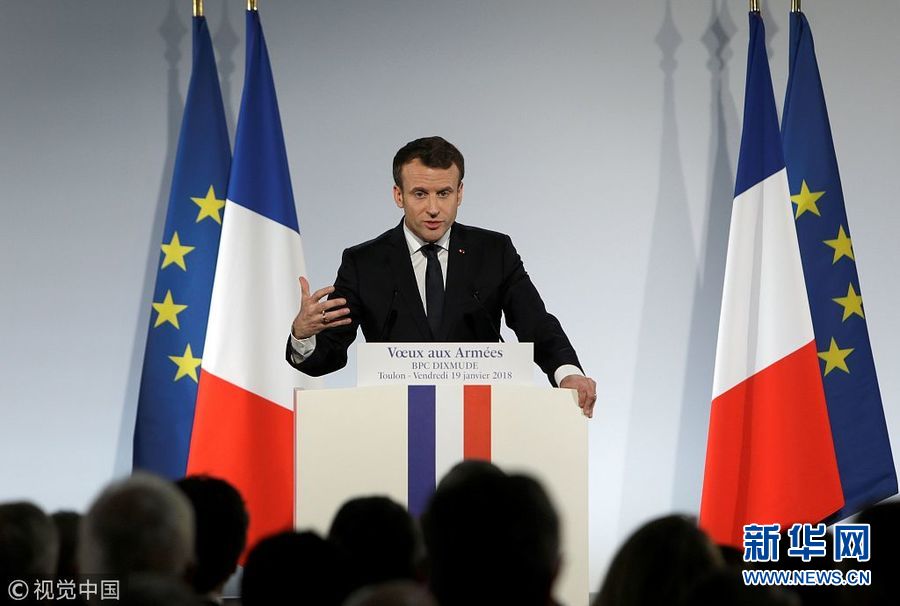 1月19日,法國(guó)土倫,法國(guó)總統(tǒng)馬克龍視察了當(dāng)?shù)氐暮\娀夭⑾蚴勘鴤儼l(fā)表新年祝福。(圖片來源:視覺中國(guó))