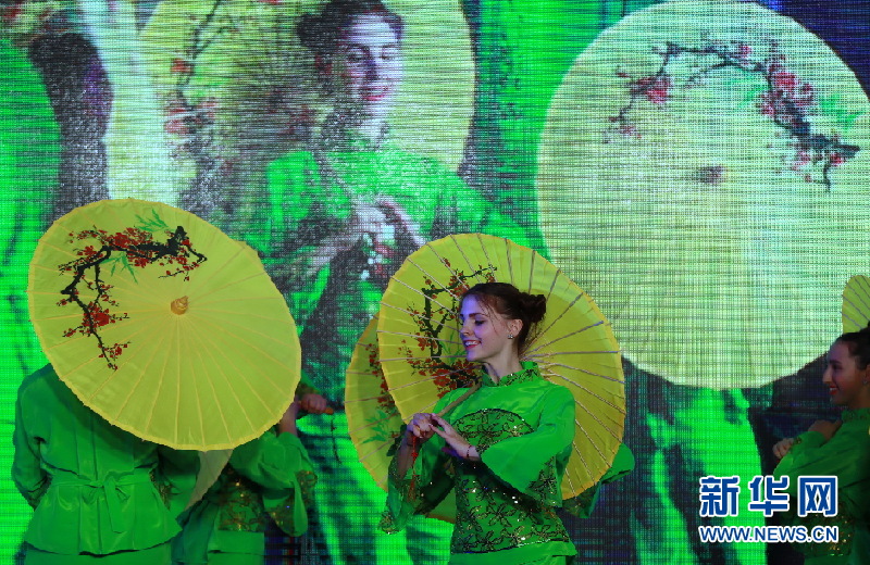 ?。痹拢玻橙眨瑸蹩颂m基輔第一東方語言學(xué)校的學(xué)生表演傘舞。新華網(wǎng)發(fā)(陳俊鋒攝)