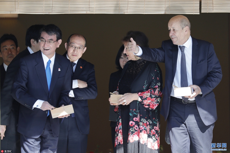 當(dāng)?shù)貢r間2018年1月27日,日本東京,日本外相河野太郎接待到訪的法國外長讓·伊夫·勒德里昂及其夫人,帶其參觀赤坂宮,體驗(yàn)喂魚。(圖片來源:東方ic)