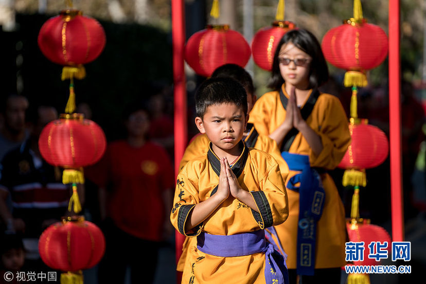 當?shù)貢r間1月28日,美國洛杉磯,當?shù)谿rove商場舉行少林武術(shù)表演以及其他中國文化類的演出,慶祝傳統(tǒng)新年,場外攤位還有傳統(tǒng)剪紙,捏面人,糖畫,彩繪等項目。圖為少林功夫表演。(圖片來源:視覺中國)