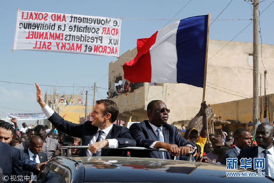 當(dāng)?shù)貢r(shí)間2月3日,塞內(nèi)加爾圣路易,塞內(nèi)加爾總統(tǒng)馬基·薩勒陪到訪的法國(guó)總統(tǒng)馬克龍?jiān)煸L當(dāng)?shù)?,兩人乘?chē)向民眾致意。(圖片來(lái)源:視覺(jué)中國(guó))