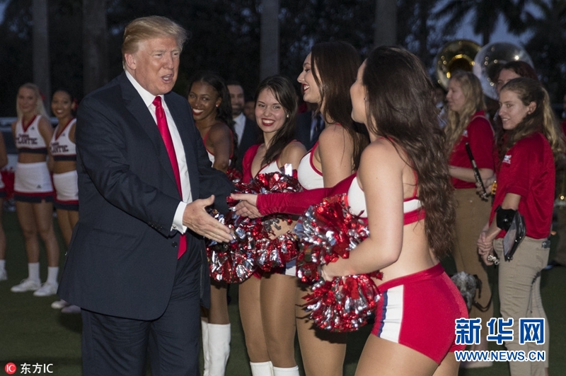 當(dāng)?shù)貢r(shí)間2018年2月4日,美國(guó)佛州西棕櫚灘,美國(guó)總統(tǒng)特朗普與第一夫人梅拉尼婭在高爾夫俱樂(lè)部觀看大學(xué)生樂(lè)隊(duì)的歡迎演出,與美女啦啦隊(duì)員握手。據(jù)悉,特朗普夫婦出席在該俱樂(lè)部舉辦的超級(jí)碗派對(duì)。(圖片來(lái)源:東方IC)