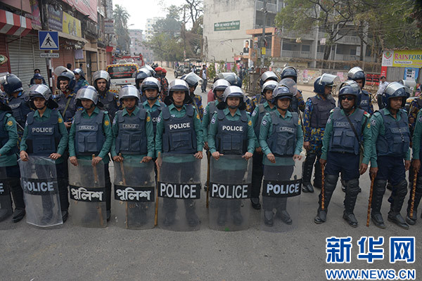 2月8日,在孟加拉國首都達卡,警察在街頭警戒。新華社發(fā)(薩利姆·禮薩 攝)