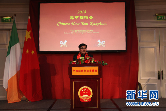 岳曉勇大使在致辭中表示,2018年春節(jié)是中國共產(chǎn)黨十九大勝利召開后的第一個(gè)春節(jié),也是中國人民在以習(xí)近平同志為核心的黨中央領(lǐng)導(dǎo)下邁入中國特色社會(huì)主義新時(shí)代的第一個(gè)春節(jié)。值此新春佳節(jié)來臨之際,中國駐愛使館向長期致力于中愛友好的的各界人士表示誠摯的問候和新春祝福。2017年,中愛關(guān)系取得了令人欣喜的進(jìn)展。雙方高層互訪保持頻繁;兩國貿(mào)易和投資大幅增長,雙邊貿(mào)易同比增長36.7%,愛爾蘭對(duì)華投資同比增長3.5倍;兩國在教育、科技、文化等領(lǐng)域的交流與合作也邁上了新臺(tái)階,愛爾蘭政府已決定將漢語納入該國的高考課程。