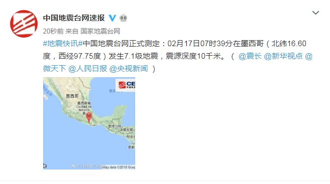 新華社快訊:中國(guó)地震臺(tái)網(wǎng)正式測(cè)定:2月17日7時(shí)39分,在墨西哥(北緯16.60度,西經(jīng)97.75度)發(fā)生7.1級(jí)地震,震源深度10公里。