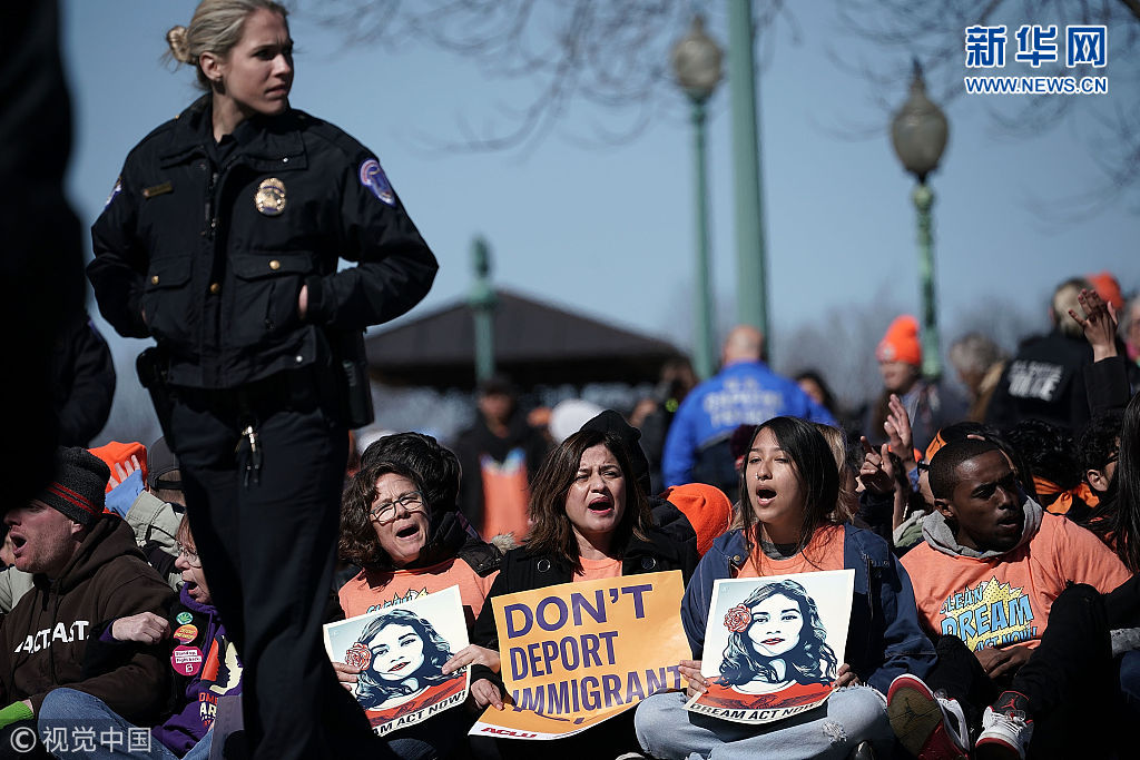 當(dāng)?shù)貢r間2018年3月5日,美國華盛頓,移民活動家在國會山舉行集會,抗議特朗普終結(jié)“夢想法案”計劃。(圖片來源:視覺中國)