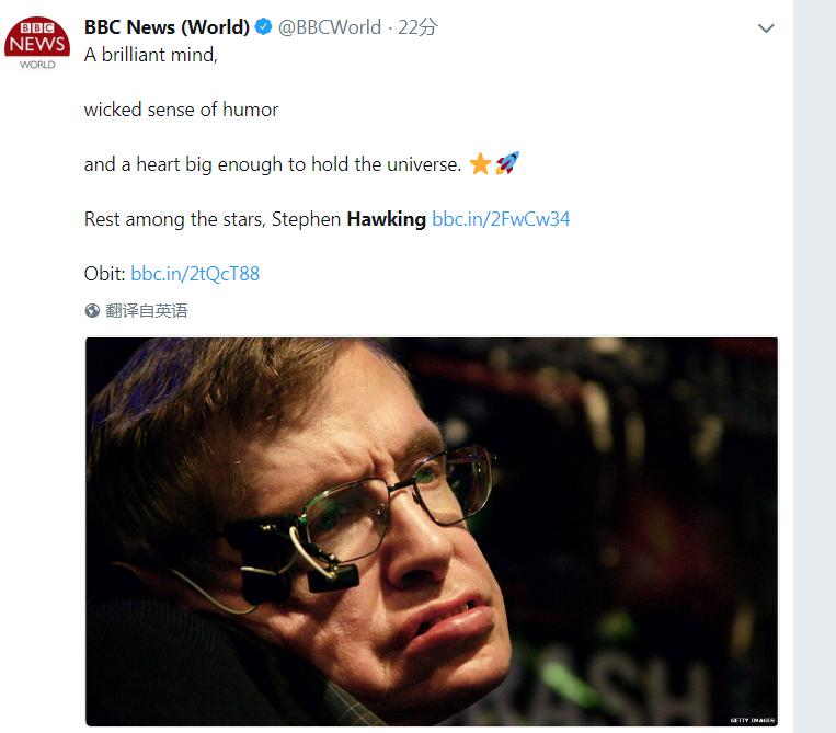 英國(guó)廣播公司(BBC)表示,一個(gè)聰明的頭腦,有點(diǎn)“惡趣味”,一個(gè)足矣容納宇宙的心臟。在星辰中安息吧,霍金。