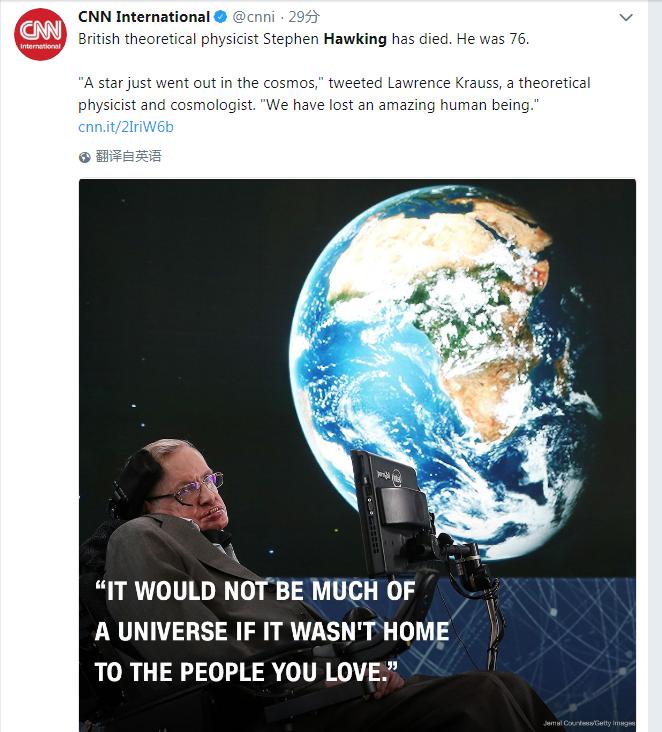 美國(guó)有線電視新聞網(wǎng)(CNN)引用理論物理學(xué)家、宇宙學(xué)家Lawrence Krauss的推特說(shuō):“一顆星剛剛在宇宙中熄滅,我們失去了一位了不起的人”。
