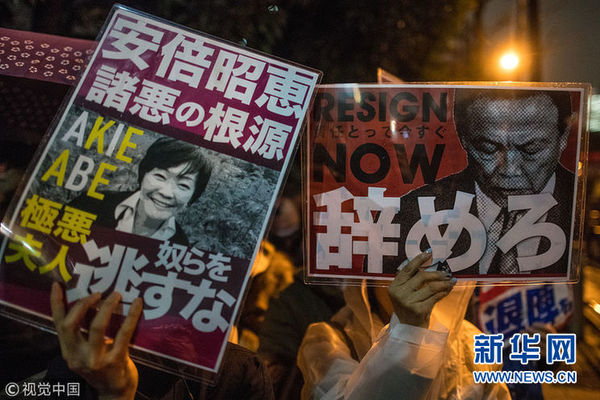 3月16日,日本東京,民眾游行抗議首相安倍晉三和財(cái)政大臣麻生太郎。