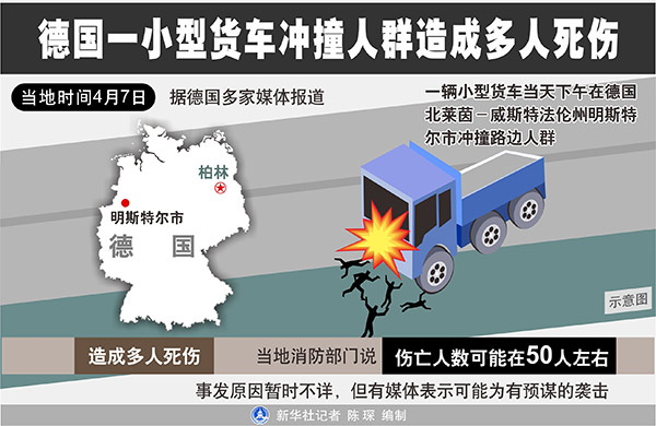 新華社柏林4月7日電(記者袁帥 沈忠浩)據(jù)德國多家媒體7日報道,一輛小型貨車當天下午在德國西部北萊茵-威斯特法倫州明斯特爾市沖撞路邊人群,造成多人死傷。當?shù)叵啦块T說,傷亡人數(shù)可能在50人左右。