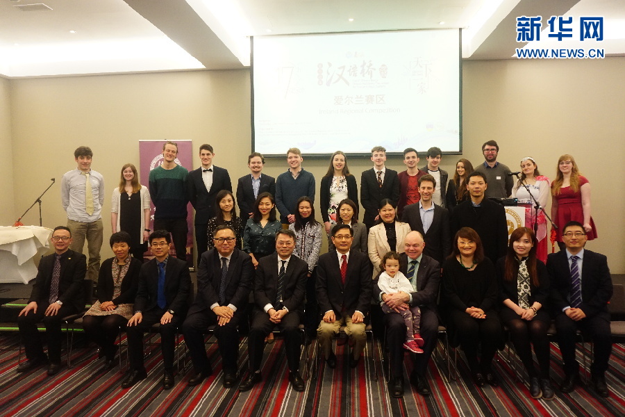 嘉賓和評委與參賽選手合影。4月7日,第17屆“漢語橋”世界大學(xué)生中文比賽愛爾蘭賽區(qū)選拔賽在首都都柏林舉行。新華網(wǎng)發(fā)