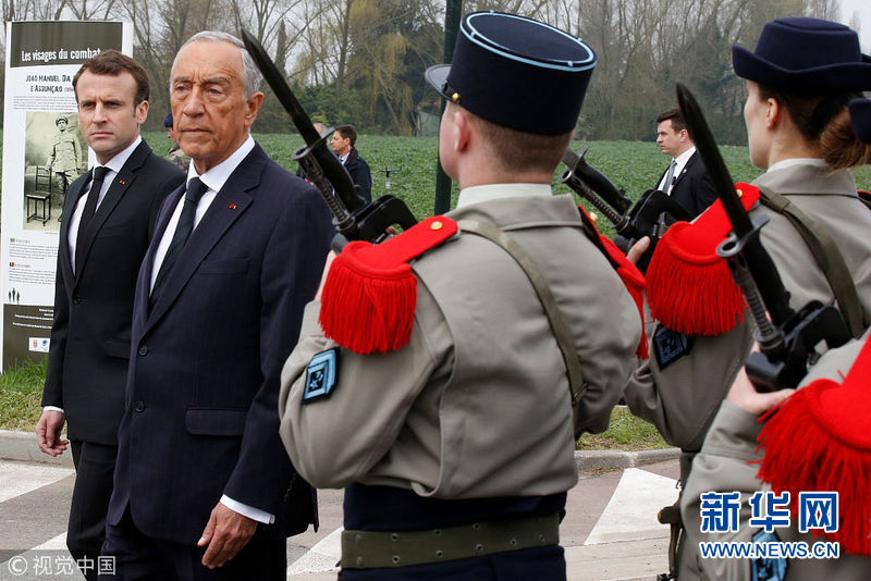 4月9日,法國(guó)里什堡,法國(guó)總統(tǒng)馬克龍和葡萄牙總統(tǒng)馬塞洛·雷貝洛·德索薩在一戰(zhàn)葡萄牙公墓出席一戰(zhàn)紀(jì)念儀式,紀(jì)念利斯戰(zhàn)役百年。(圖片來(lái)源:視覺中國(guó))