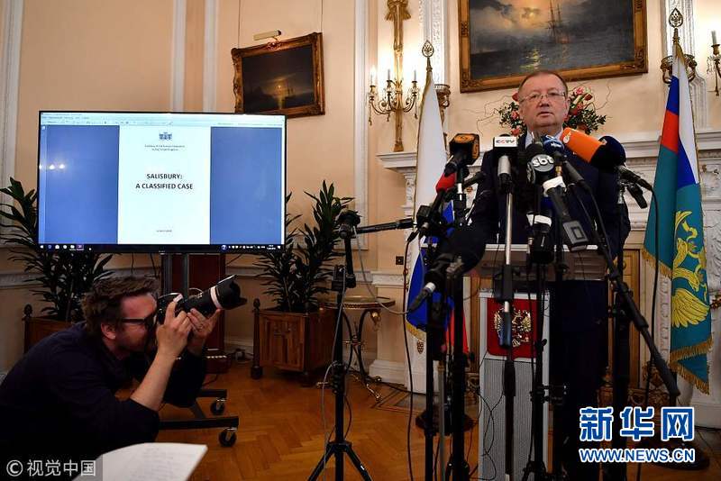 4月13日,英國(guó)倫敦,俄羅斯駐英大使亞歷山大·雅克梵克就前特工中毒事件的調(diào)查結(jié)果召開(kāi)新聞發(fā)布會(huì)。(圖片來(lái)源:視覺(jué)中國(guó))