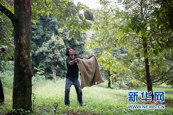 新華網(wǎng)曼谷4月24日電(陳家寶)23日清晨,在泰國曼谷以東約250公里的莊他武里府的果園里,綴滿榴蓮的高樹上,黝黑的果農(nóng)爬上枝椏,割下一個(gè)個(gè)約3公斤重的果實(shí)。