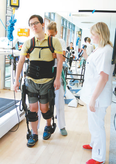 民眾在德國體驗背負式康復(fù)機器。記者 管克江 攝