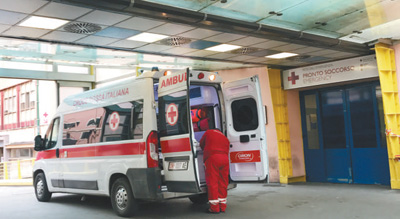 意大利羅馬一家大型綜合醫(yī)院,這里頻繁有救護車抵達運送病人。圖為其中一輛剛剛運送病人抵達急診室的急救車。記者 韓碩 攝