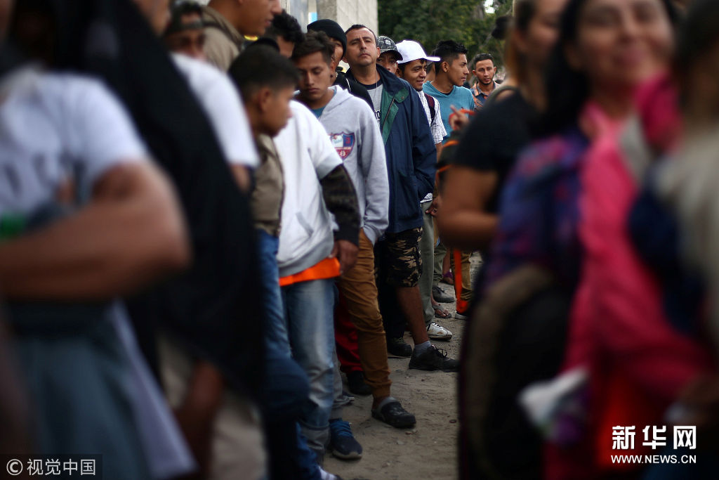 ??? 當(dāng)?shù)貢r(shí)間2018年4月27日,墨西哥提華納,中美洲移民領(lǐng)取早餐。一批中美洲尋求避難人群抵達(dá)墨西哥北部邊陲城市提華納,距離他們的最終目的地——美國加利福尼亞州僅“一步之遙”。(圖片來源:視覺中國)